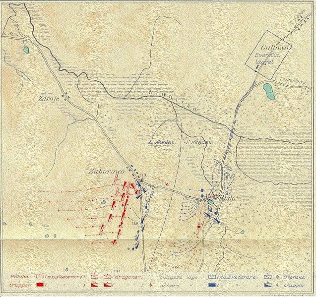 Zaborowo na prawym skrzydle polskim. Polacy podpalili zabudowania wsi i na oddział ten ruszyły 4 chorągwie husarskie odrzucając go od polskich pozycji.