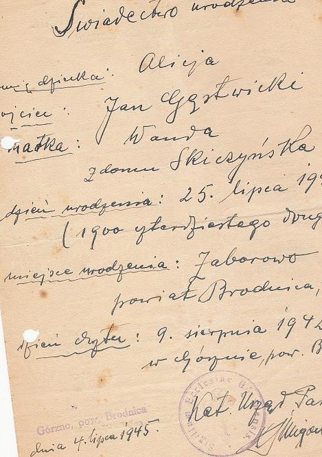 Eligiusz Gęstwicki pierwsza komunia 13 lipiec 1944r (ur. 29.11.1930 w Zaborowie zm.27.03.2005 w Grudziądzu ). Alicja komunię przyjmowała już w Zbicznie. |