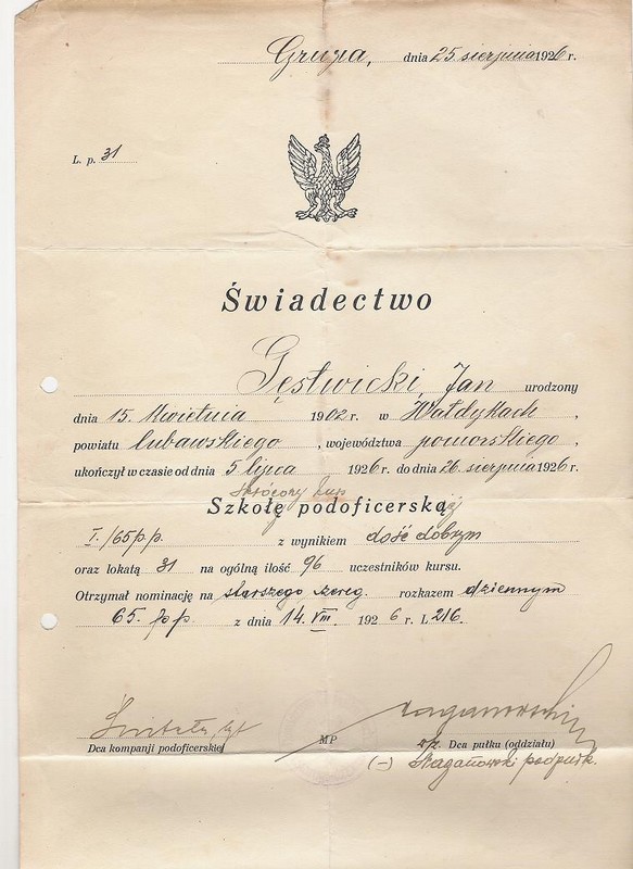 W lipcu 1926 roku pan Jan ukończył kurs szkoły podoficerskiej. |
