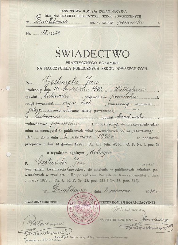 Świadectwo ukończenia praktycznego egzaminu na nauczyciela publicznych szkół powszechnych(Działdowo 02.06.1930 rok. |
