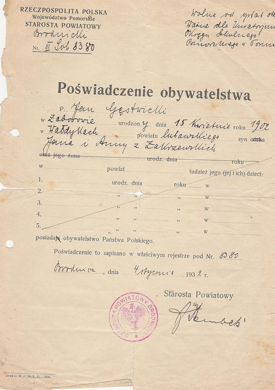 Dokument poświadczenia obywatelstwa z 1932 roku. |