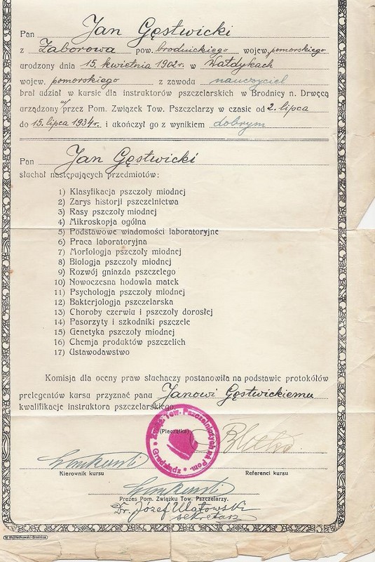 Ukończenie kursu pszczelarskiego w lipcu 1934 roku w Grudziądzu. |