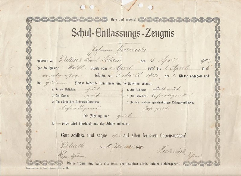 Świadectwo szkolne Jana Gęstwickiego w języku niemieckim. Wystawione w 1920 roku. |