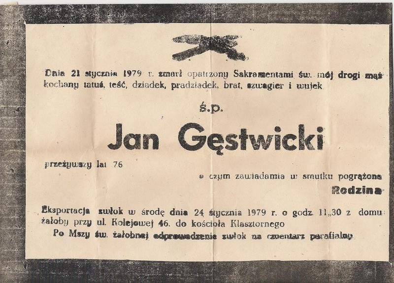 Jan Gęstwicki zmarł 21 stycznia 1979 roku. |