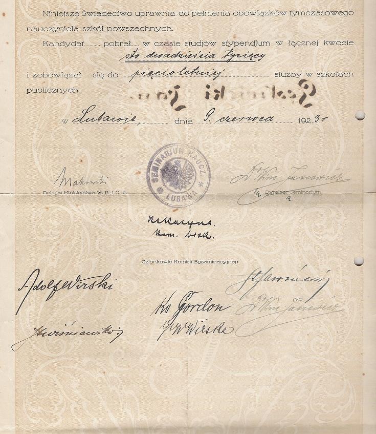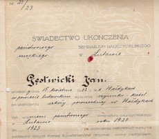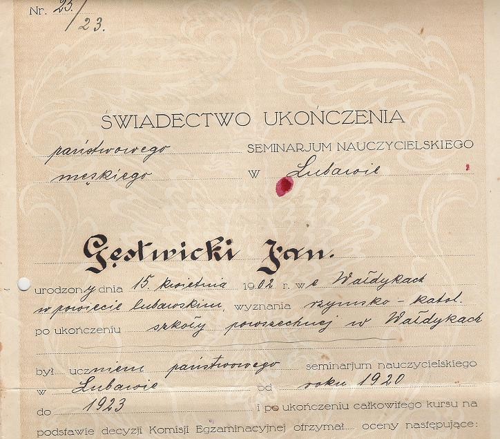 Świadectwo ukończenia seminarium nauczycielskiego w Lubawie - lata 1920 do 1923 |