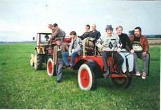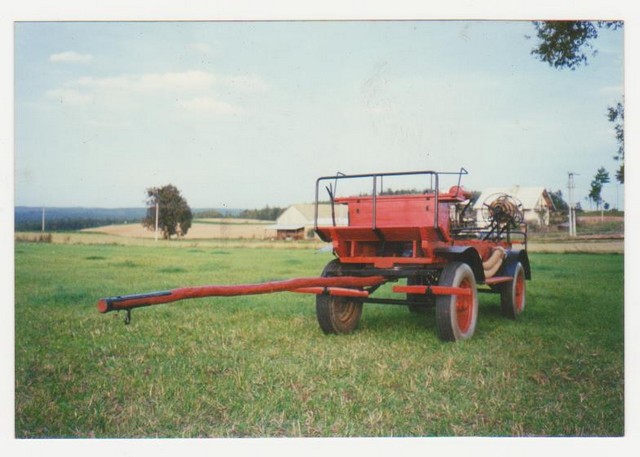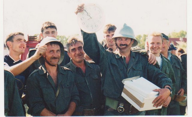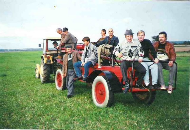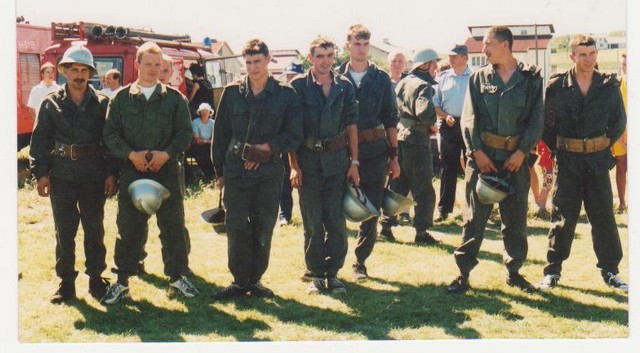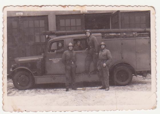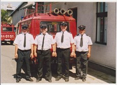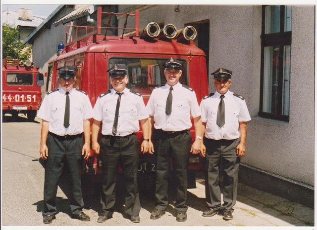 | Mechaniczny wóz bojowy dawniej | Wozy bojowe dzisiaj . Od lewej : Bogdan Krzemieniewski , Tadeusz Kwas , Józef Narodzonek ( obecny naczelnik osp ) ,Henryk Luda |