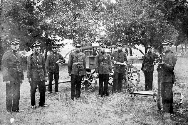 Przedwojenna drużyna strażacka na tle sikawki (boisko szkolne).