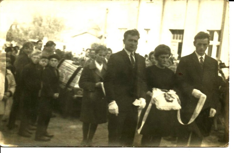 Pogrzeb Ryszarda Szóstakowskiego. Zginął na motocyklu między Zaborowem a Rudziskami w 1966 roku (ze zdjęciem idą: Ludwik Kwas, Elżbieta Szóstakowska, Grzegorz Kwas).