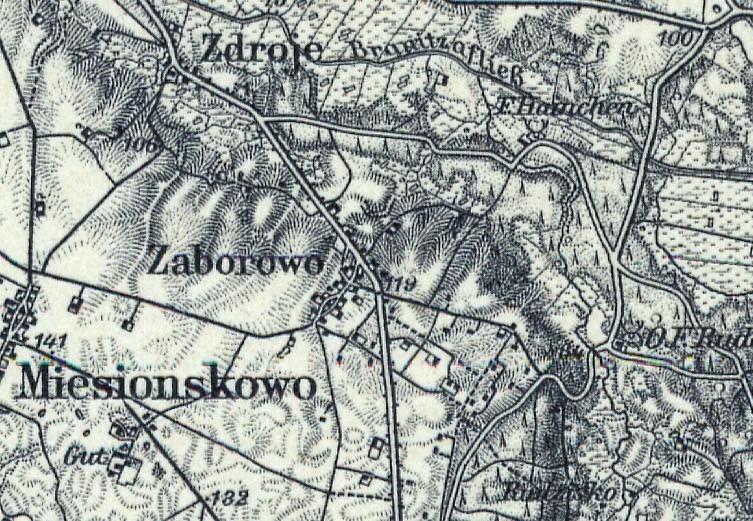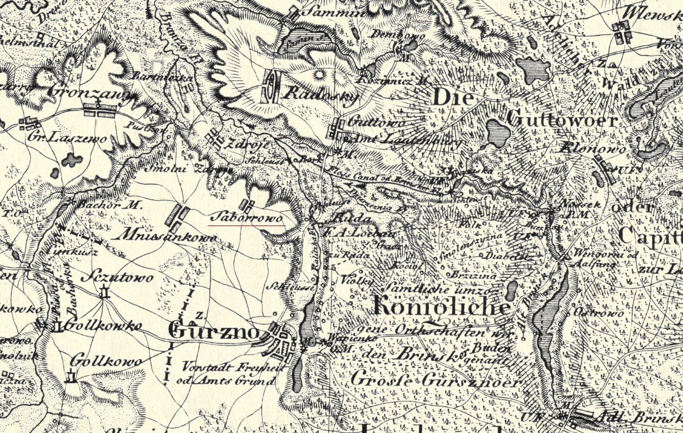 Fragment mapy Schrottera obrazującej stan terenu z końca osiemnastego wieku (1796 r.), Zaborowo (Saborrowo). Skan ze Słownika Geograficznego z notką dotyczącą Zaborowa. |