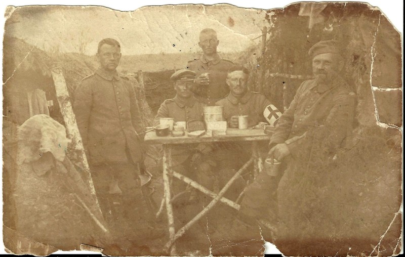 Zdjęcie wysłane, w lipcu 1915 roku, jako pocztówka z frontu pierwszej wojny światowej przez Kazimierza Ochockiego (pierwszy z lewej) z Zaborowa.