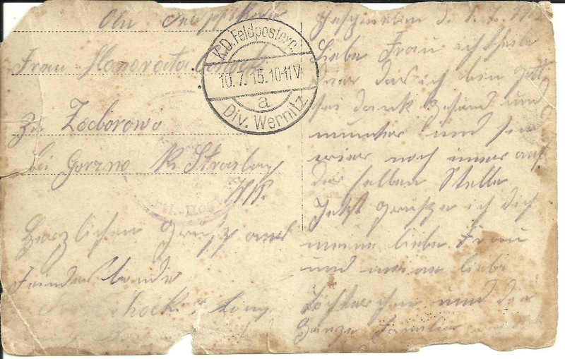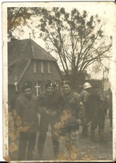 Zdjęcie wysłane, w lipcu 1915 roku, jako pocztówka z frontu pierwszej wojny światowej przez Kazimierza Ochockiego (pierwszy z lewej) z Zaborowa. |