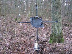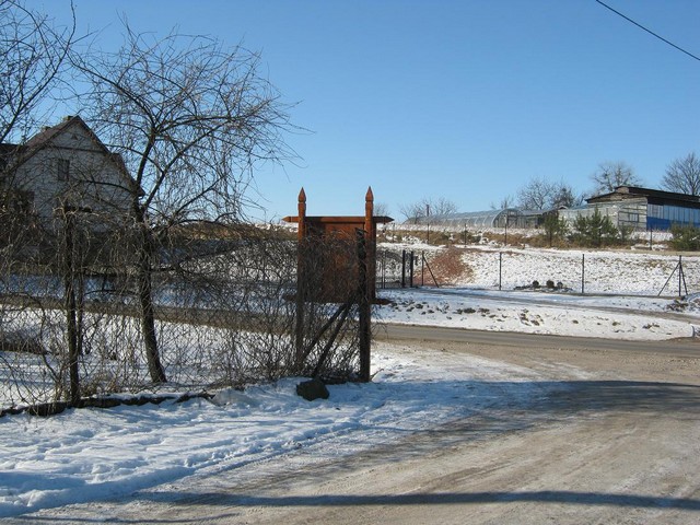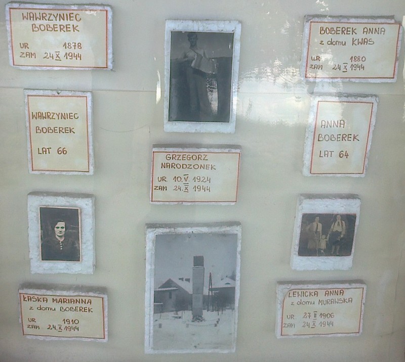 Gablota pamiątkowa zamordowanych mieszkańców Zaborowa w 1944 roku przez Hitlerowców. Została wykonana przez uczniów Maksymiliana Szóstakowskiego na początku lat 70-tych (zdjęcie z lewej). Od tego miejsca, w kierunku Fiałek, ok. 200 m znajduje się miejsce mordu (zdjęcie z prawej). |