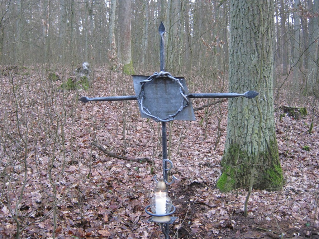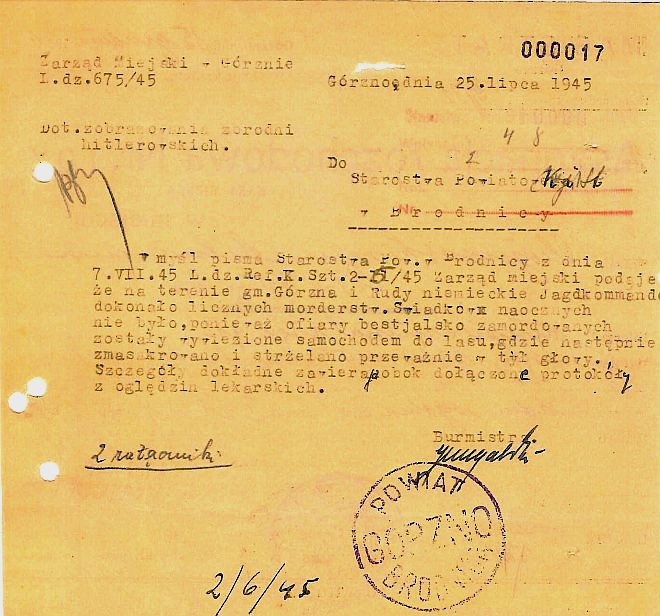 Notatka dotycząca zbrodni hitlerowców na mieszkańcach gminy Górzno. Krzyż w miejscu mordu i pogrzebania zwłok zamordowanych mieszkańców Zaborowa. Znajduje się on 30 metrów za nowo powstałym pomnikiem po prawej stronie. Wiosną i jesienią można pod krzyżem zauważyć już ledwo widoczne zagłębienia po mogiłach.