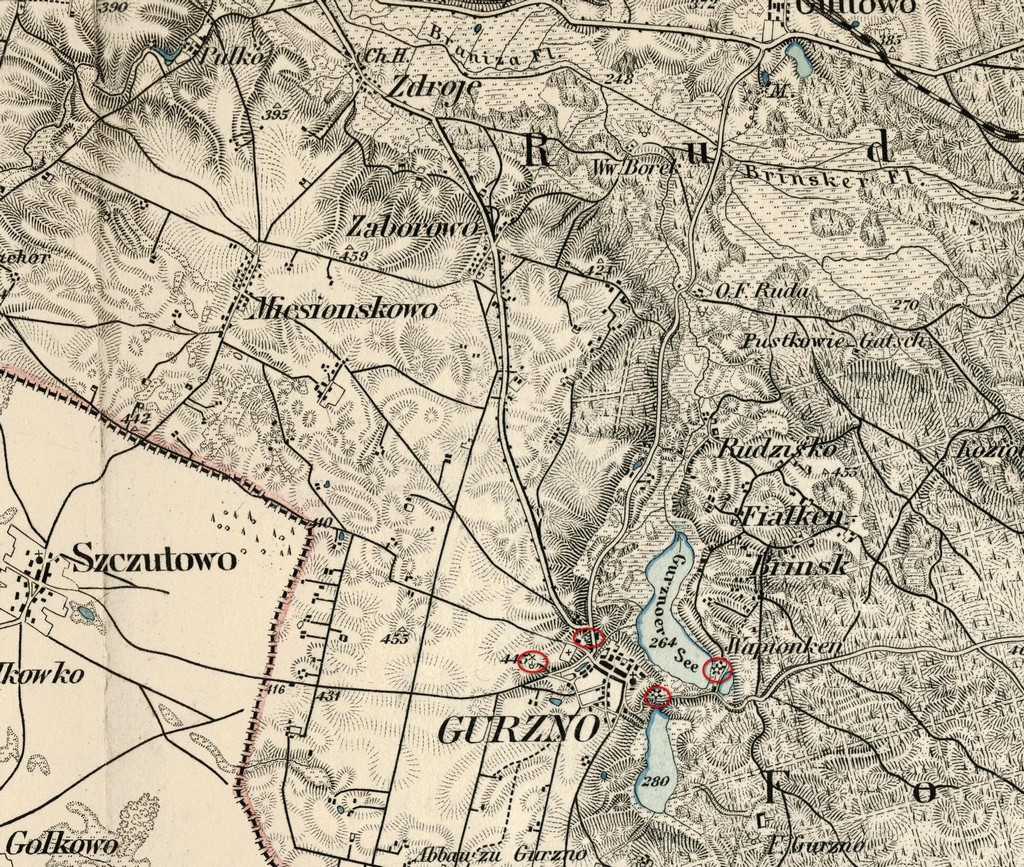 Fragment mapy Zaborowa i okolic z 1892. W tym czasie w Górznie zaznaczono na mapie dwa młyny (Wapionka i młyn państwa Kilanowskich pomiędzy jeziorami), dwa wiatraki ( na wjeździe od strony Zaborowa i na wjeździe od strony Szczutowa).