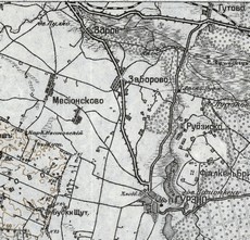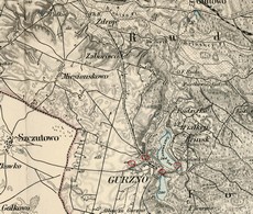 Fragment mapy Zaborowa i okolic z 1892. W tym czasie w Górznie zaznaczono na mapie dwa młyny (Wapionka i młyn państwa Kilanowskich pomiędzy jeziorami), dwa wiatraki ( na wjeździe od strony Zaborowa i na wjeździe od strony Szczutowa). Drugi fragment mapy jest z roku 1915. Jak widać jest to mapa rosyjska. |