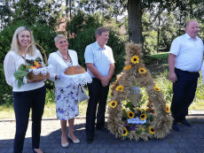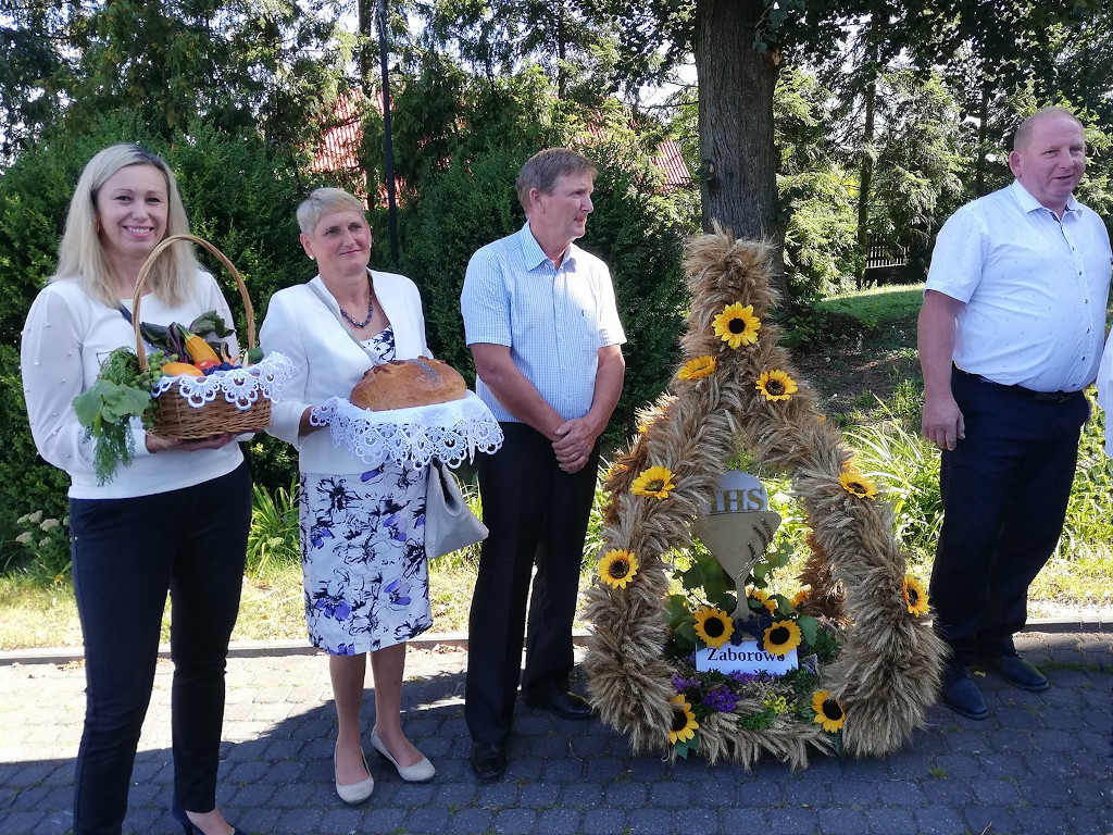 Wręczanie chleba i wieńca dożynkowego władzom Gminy Górzno. Na zdjęciu od lewej: Ludwik Narodzonek, Elżbieta Zadrożna, Krystyna Sugalska, Hellena Gąsiorowska, Krystyna Ochocka, Roman Skamarski naczelnik Gminy Górzno. W tle przystanek PKS i szkoła w Zaborowie.